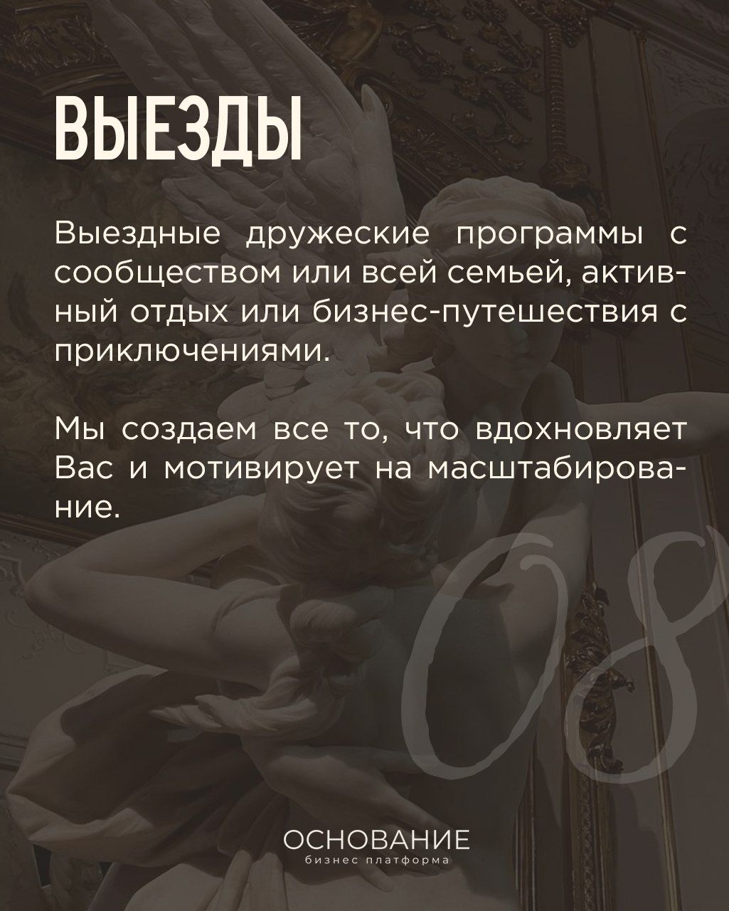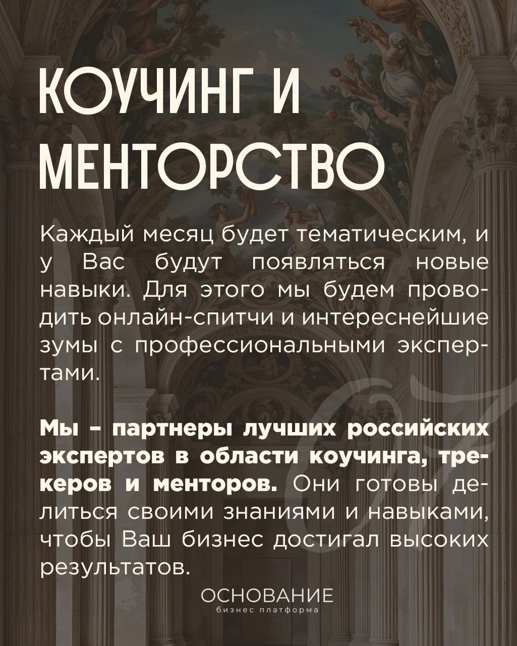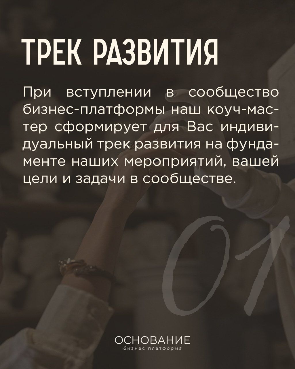 Миссия бизнес-платформы «ОСНОВАНИЕ» – дать Вам инструменты для гармоничного и разностороннего развития личности, возможности проявить себя в публичном поле, сформировать сильное окружение, высокий статус делового пространства.